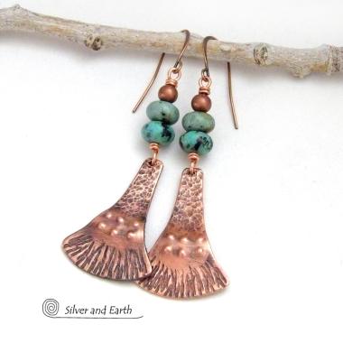 Rustic Copper Earrings with Earthy Organic Texture and Natural African Turquoise Stones