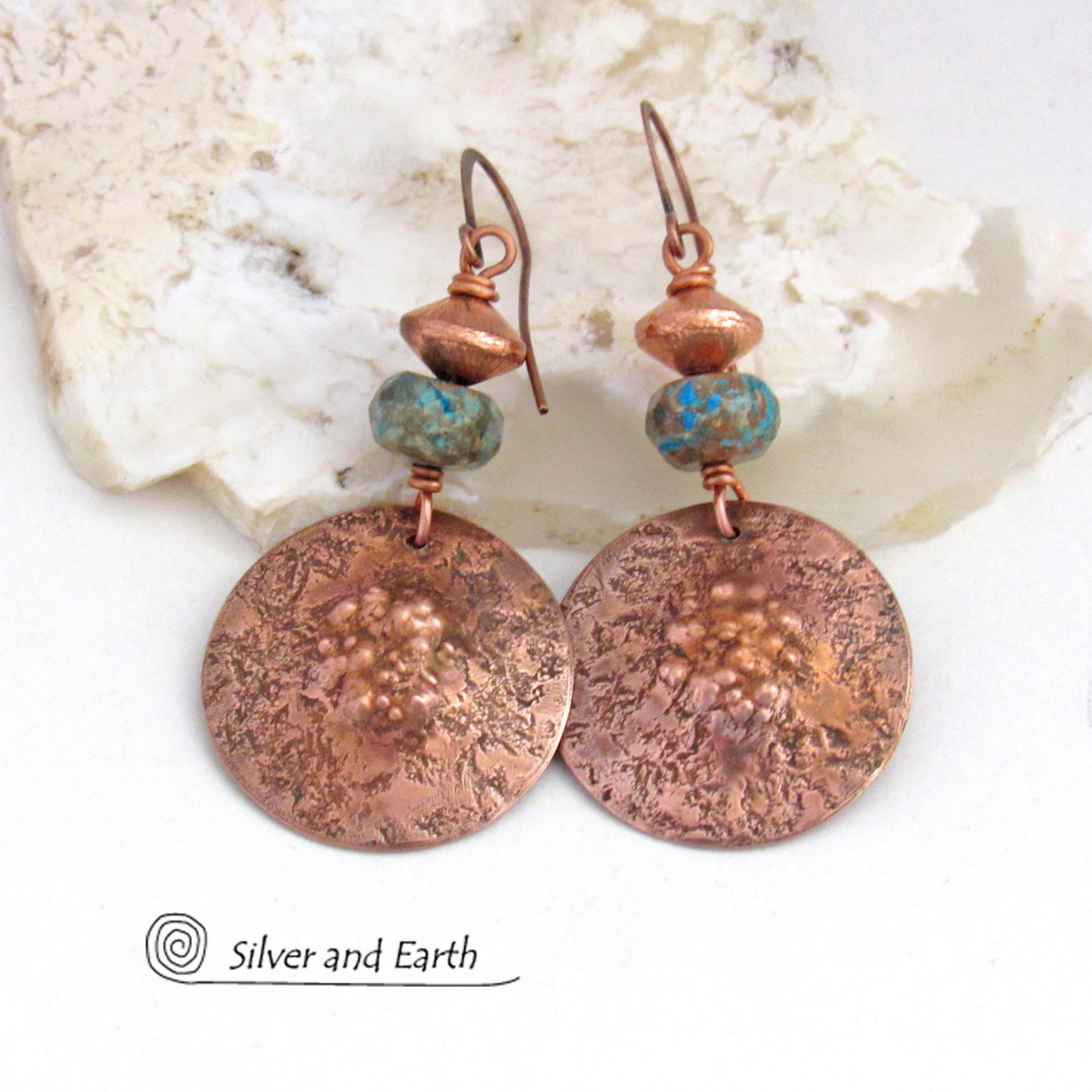 These earrings feature round copper dangles with a rustic, organic hammered texture accented with faceted calsilica jasper stones and brushed satin copper beads. The stones have a pretty blue hue combined with an earthy brown matrix. They have a modern style with a subtle bohemian flair that works well with all wardrobe types. They'll make a great gift for couples celebrating their 7th wedding anniversary --- copper is the traditional choice for this anniversary.