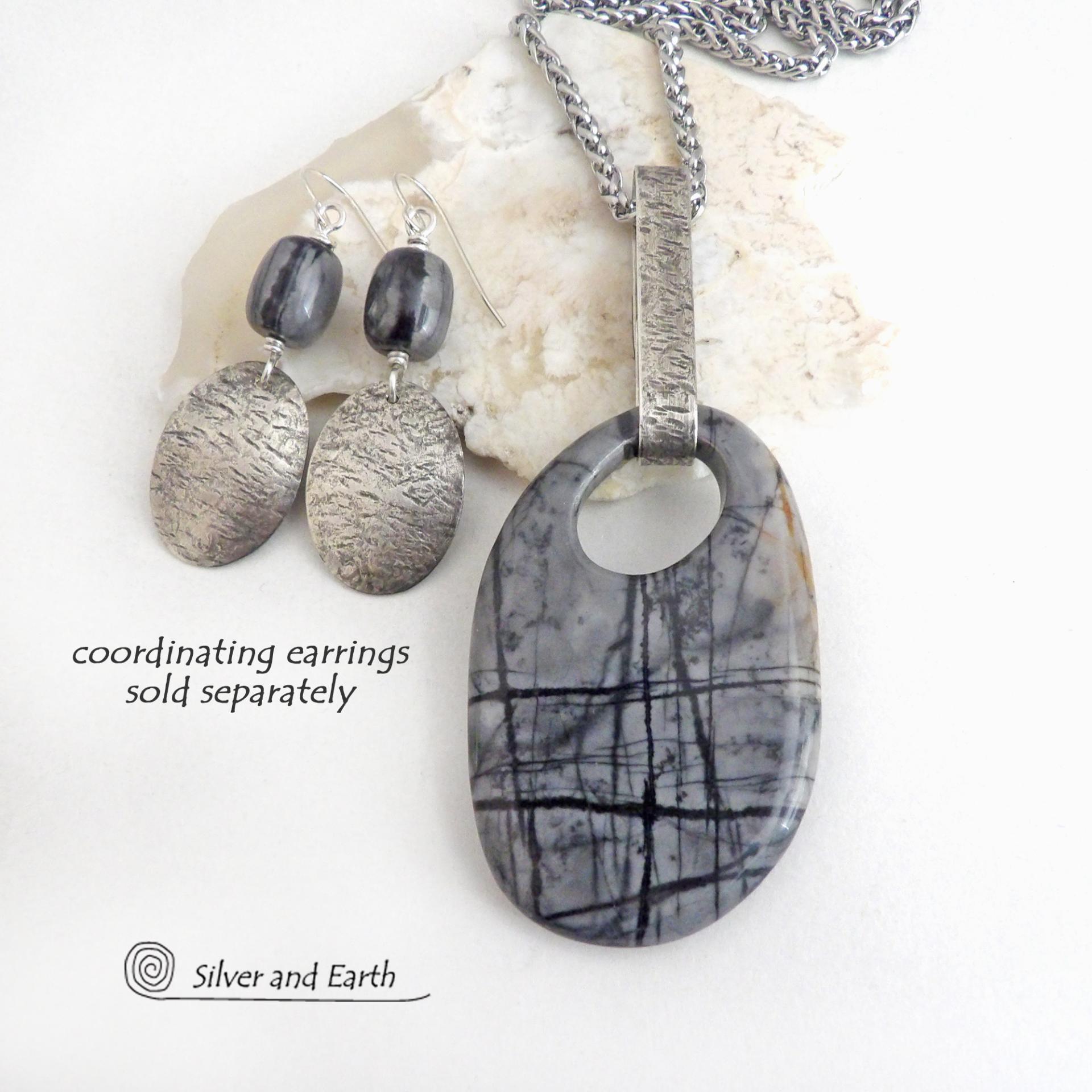 Coordinating earrings sold separately: https://www.silverandearth.com/product/sterling-silver-dangle-earrings-grey-black-picasso-marble-gemstones-artisan-handmade-earthy